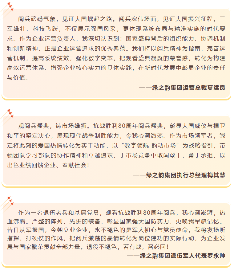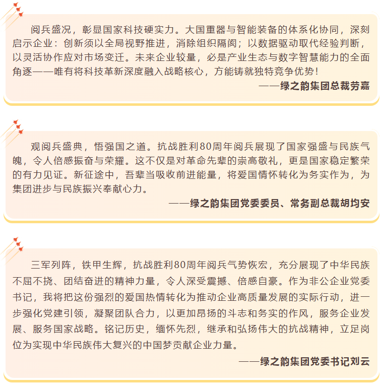 致敬偉大勝利,汲取奮進力量。綠之韻集團董事長胡國安在觀看閱兵儀式后表示,閱兵儀式展現(xiàn)的大國風范和民族精神,正是綠之韻22年來砥礪前行的力量源泉。站在歷史與未來的交匯點,我們要更加深刻認識到企業(yè)發(fā)展與國家命運息息相關(guān)。觀看閱兵儀式是一次深刻的愛國主義教育和精神洗禮,抗戰(zhàn)精神是企業(yè)發(fā)展不可或缺的精神財富。通過此次觀閱活動,希望全體綠之韻人要進一步汲取歷史智慧、錘煉政治品格,將閱兵儀式所展現(xiàn)的團結(jié)奮進、自強不息的精神轉(zhuǎn)化為推動企業(yè)創(chuàng)新發(fā)展的實際行動。未來,綠之韻集團將繼續(xù)深化黨建與企業(yè)發(fā)展同頻共振,引領(lǐng)公司在新時代征程中踐行社會責任、展現(xiàn)企業(yè)擔當,為實現(xiàn)中華民族偉大復(fù)興貢獻力量。
