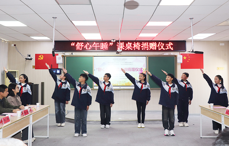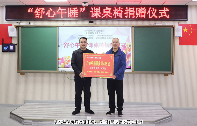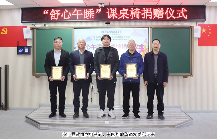 活動伊始,參加活動的領(lǐng)導(dǎo)嘉賓一行參觀了校園建設(shè)和學(xué)生午休課桌椅的使用情況。從過去孩子們“趴桌睡”的局促與不適,到如今“躺著睡”的舒適與放松,這批“可躺式”課桌椅承載著大愛與希望,為孩子們營造了更加健康舒適的學(xué)習(xí)環(huán)境,也為安化教育高質(zhì)量發(fā)展注入了溫暖而堅實的力量?;顒蝇F(xiàn)場,少先隊員們一首《潤澤桑梓 賦能教育》詩朗誦表演,用行動向愛心企業(yè)和人士表達了誠摯的感謝。隨后,安化縣煙溪鎮(zhèn)人民政府黨委書記謝昂在致辭中感謝了以綠之韻為代表的諸多愛心企業(yè)、商會與愛心志愿者們對學(xué)校及孩子們的關(guān)愛與幫助?,F(xiàn)場捐贈環(huán)節(jié),長沙市安化商會會長、綠之韻集團董事長胡國安與其他愛心商會、企業(yè)代表現(xiàn)場愛心舉牌。安化縣政協(xié)黨組書記、主席胡能華為愛心企業(yè)頒發(fā)捐贈證書。